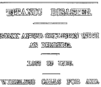 "...it seems to me that the disaster about to occur was the event that not only made the world rub its eyes and awake, but woke it with a start...to my mind the world of today awoke April 15th, 1912..." Jack Thayer, Titanic Survivor "...her lights, which had shone without a flicker all night, went out suddenly, came on again for a single flash, then went out altogether. And as they did so, there came a noise, partly a roar, partly a groan, partly a rattle, and partly a smash. When the noise was over, the Titanic was still upright like a column: we could see her not only as the stern and some 150 feet of her stood outlined against the star-specked sky, and in this position she continued for some minutes." Lawrence Beesley, Titanic Survivor "I will not go before the other men.", says Isidor Straus as He is offered a place in Lifeboat #8 with his wife. As Ida Straus steps back from the boat to rejoin her husband, "We will not be separated, as we have lived together, so will we die together." Isidor and Ida Straus, Titanic Victims "My child, when your mother comes for you, as she surely will, tell her that I loved her dearly and still do. Tell her I expected her to follow us, so that we might all live happily together in the peace and freedom of the New World." Michel Navratil tells Michel, Jr. as he passes them through to board Collapsible D, Titanic Victim "There arose to the sky the most horrible sounds ever heard by mortal man except those of us who survived this terrible tragedy. The agonizing cries of death from over a thousand throats, the wails and groans of the suffering, the shrieks of the terror-stricken and the awful gasping for breath of those in the last throes of drowning, none of us will ever forget to our dying day." Archibald Gracie, Titanic Survivor "Smoke and sparks were rushing out of her funnel. There must have been an explosion, but we had heard none. We only saw the big stream of sparks. The ship was gradually turning on her nose...I had only one thing on my mind...to get away from the suction. The band was still playing. I guess all of the band went down. I suppose I was 150 feet away when the Titanic on her nose, with her after-quarter sticking straight up in the air, began to settle slowly. Harold Bride, Titanic Survivor TITANIC SINKS FOUR HOURS AFTER HITTING ICEBERG; 866 RESCUED BY CARPATHIA, PROBABLY 1250 PERISH; ISMAY SAFE, MRS. ASTOR MAYBE, NOTED NAMES MISSING The New York Times Headlines, April 16, 1912 TITANIC DISASTER GREAT LOSS OF LIFE - EVENING NEWS Sign carried by newsboy in London streets J. J. ASTOR LOST ON TITANIC 1,500 TO 1,800 DEAD The New York American Headlines, April 16, 1912 SUFFERING INTENSE AND LOSS OF LIFE APPALLING IN OCEAN DISASTER SEA SWALLOWS TITANIC AND 1500 MEN ON BOARD; WOMEN, CHILDREN SAFE Red Wing Daily Republican Headlines, April 16, 1912
